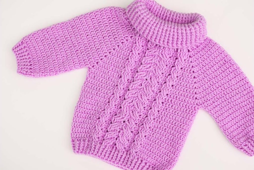 Wrap your little one in cozy luxury with this gorgeous Royal Orchid Crochet Cable Sweater! Featuring a prominent center cable panel that mimics classic knitwear and a wonderfully plush cowl neck, this garment is a timeless piece. The main body stitch (half double crochet) provides dense warmth, making this the perfect choice for the cooler seasons.