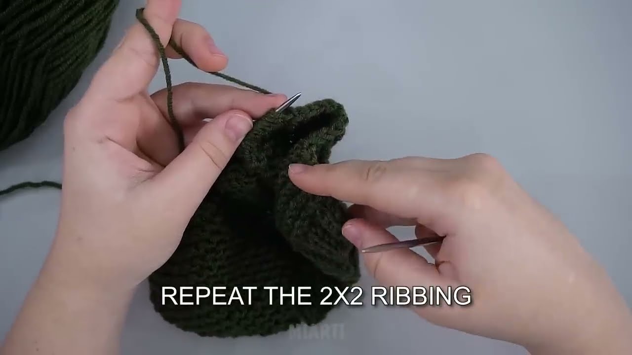 Pick up stitches around the ankle and knit 1×1 ribbing (knit 1, purl 1) for 1–2 inches.