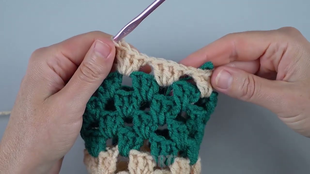 In corner space: (Ch 3, 2 dc, ch 2, 3 dc).