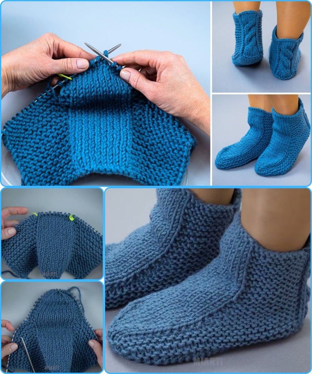 These slippers are knit in one piece, folded, and joined using a clever knit-together method instead of sewing.