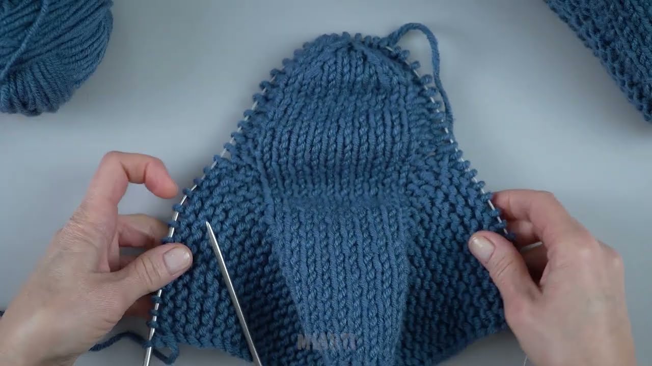 4. Bottom closed using 3-needle style “knit together” on straight needles