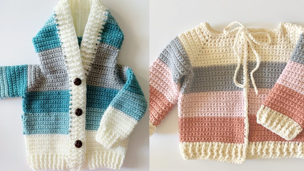 - Skill Level: Intermediate. You’ll need to work flat for the body, in the round for the sleeves, manage multiple color changes, and construct a ribbed shawl collar.