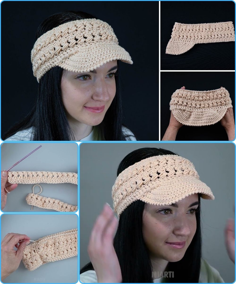 Use raffia yarn or tan cotton to create a beachy, woven visor feel.
