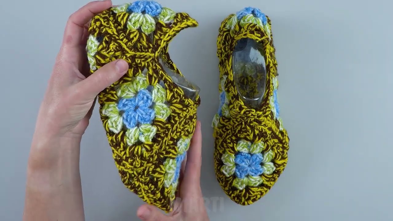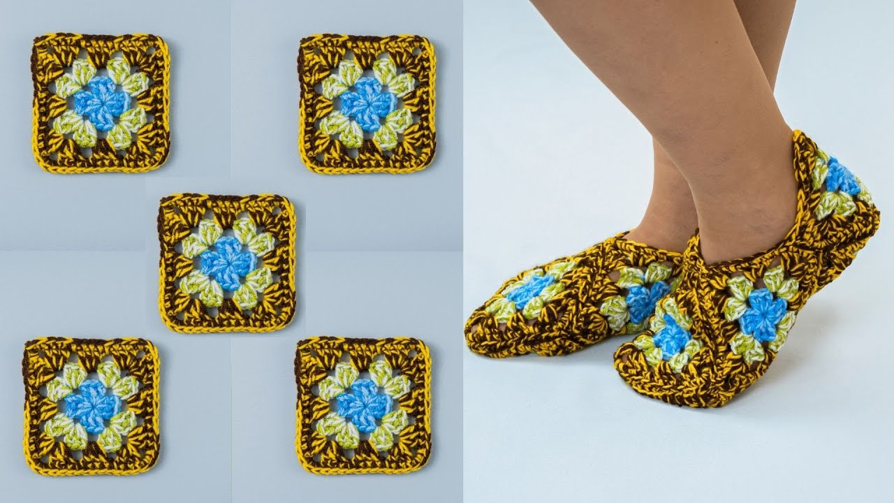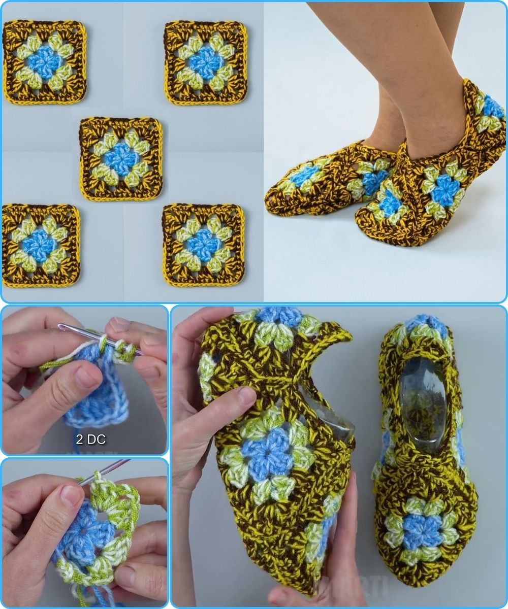 Each slipper is made from multiple granny squares (usually 5–6 squares per foot).