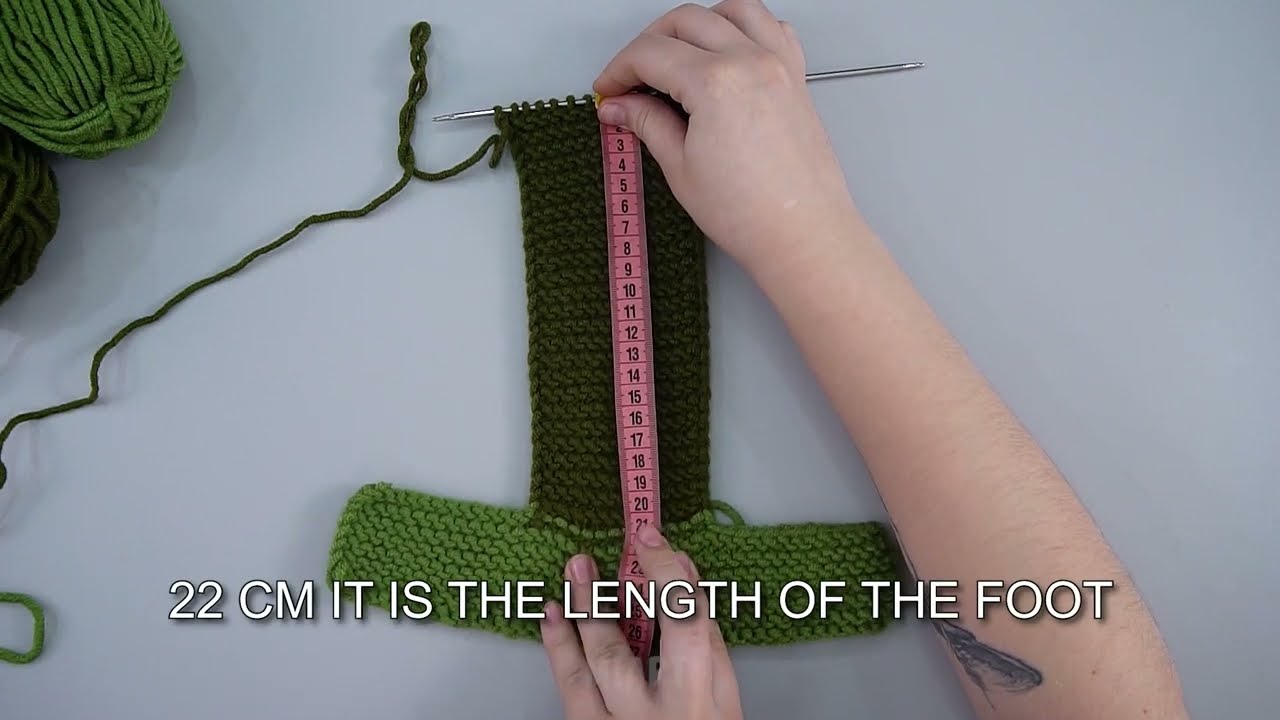 Continue knitting until the piece measures about 7–9 inches, or the length of the foot from heel to toe