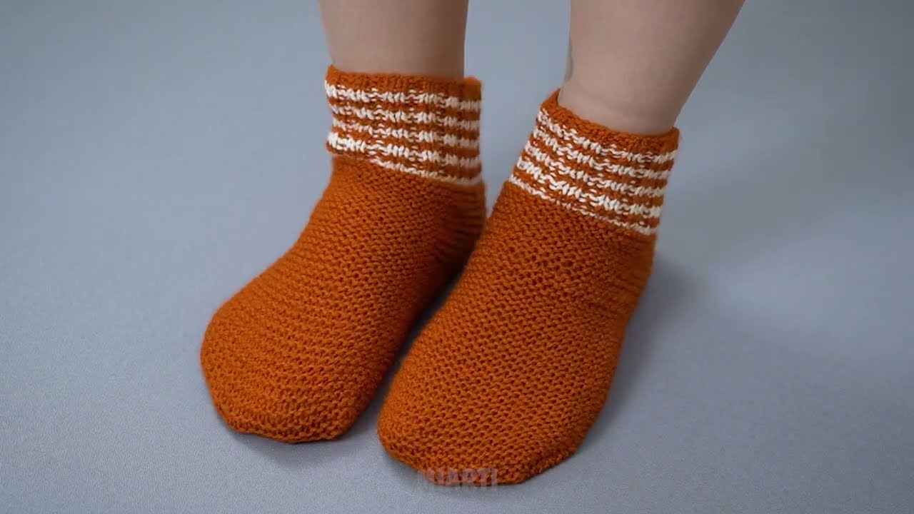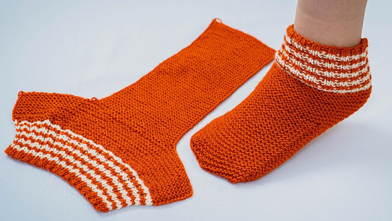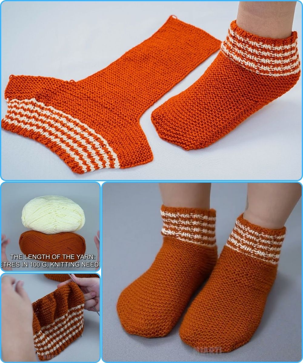 Knitted slipper-socks are warm, soft, and comfortable to wear at home. They are perfect for beginners because they do not require circular or double-pointed needles—only two straight knitting needles. This simple method allows you to knit flat and then sew the slipper together at the end.
