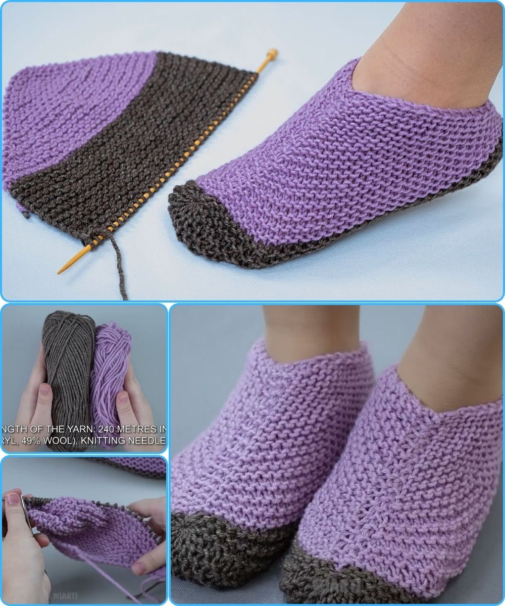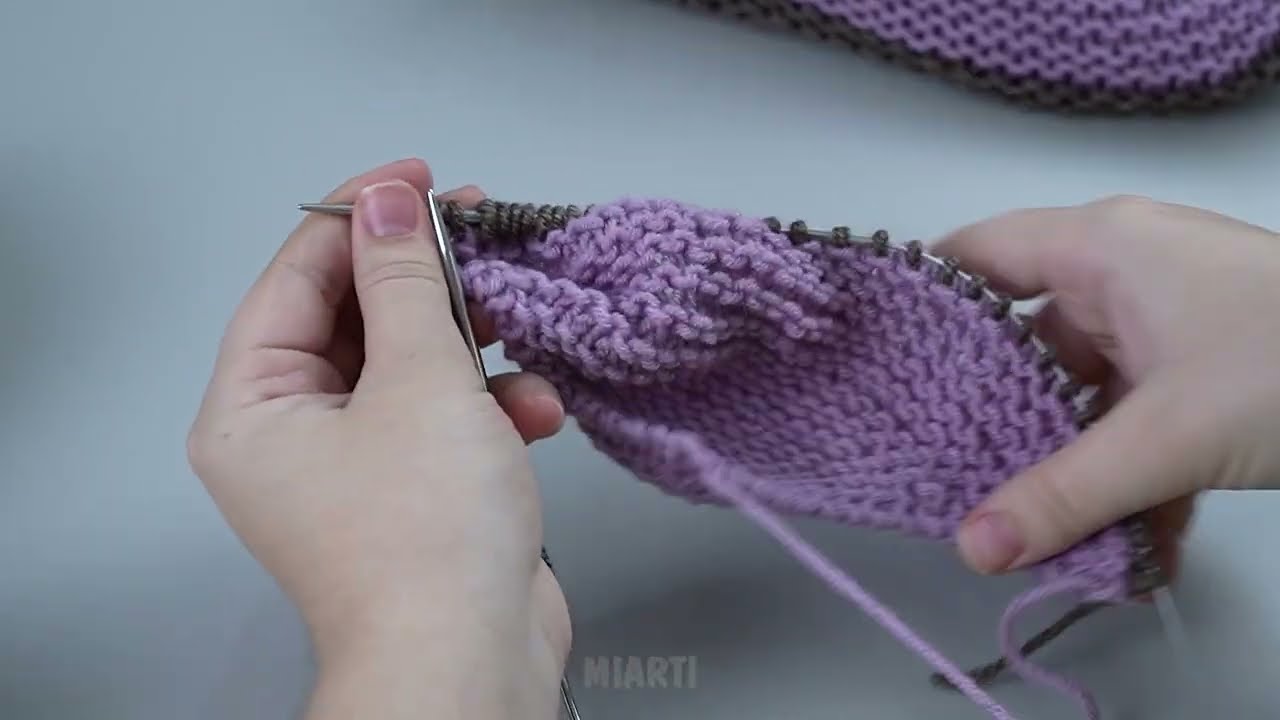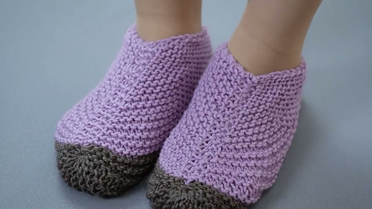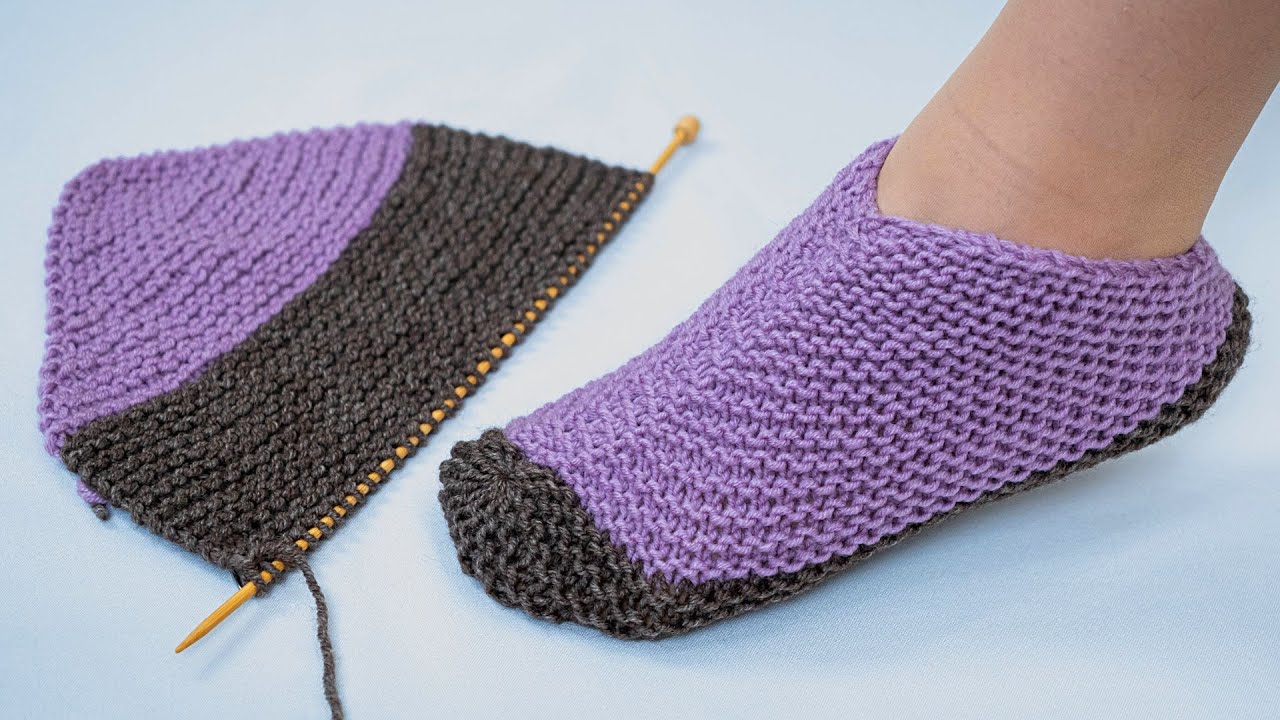 For a simple slipper: continue knitting in garter stitch until the piece is 2-3 inches tall from the sole.