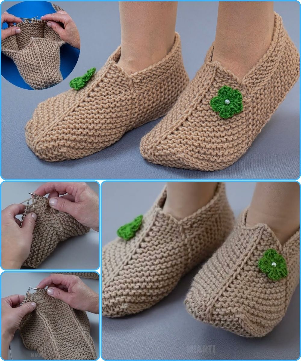 If you want cozy, comfortable slippers with no seam on the sole, this knitting method is perfect for you. These slippers are knitted flat on two straight needles, making them ideal for beginners who want professional-looking results without complicated techniques. The absence of a sole seam makes the slippers extra comfortable and durable for everyday wear.